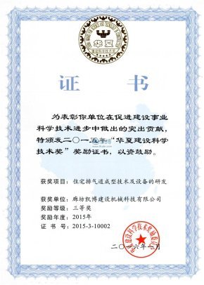 華夏建設科學技術獎 住宅排氣道成型技術及設備的研發(fā)