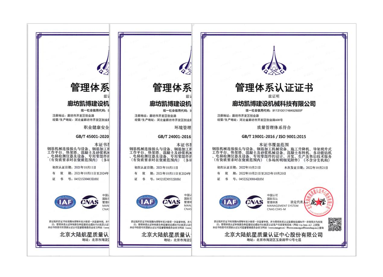 2022年9月26日至30日,北京大陸航星質(zhì)量認(rèn)證中心股份有限公司對(duì)廊坊凱博建設(shè)機(jī)械科技有限公司開展了為期5天的質(zhì)量、環(huán)境、職業(yè)健康安全管理體系外審工作,在公司領(lǐng)導(dǎo)的高度重視和各職能部門的積極配合下,外審工作順利完成。