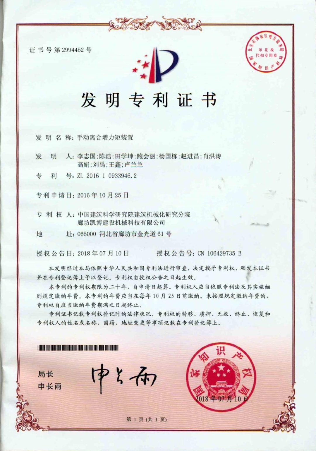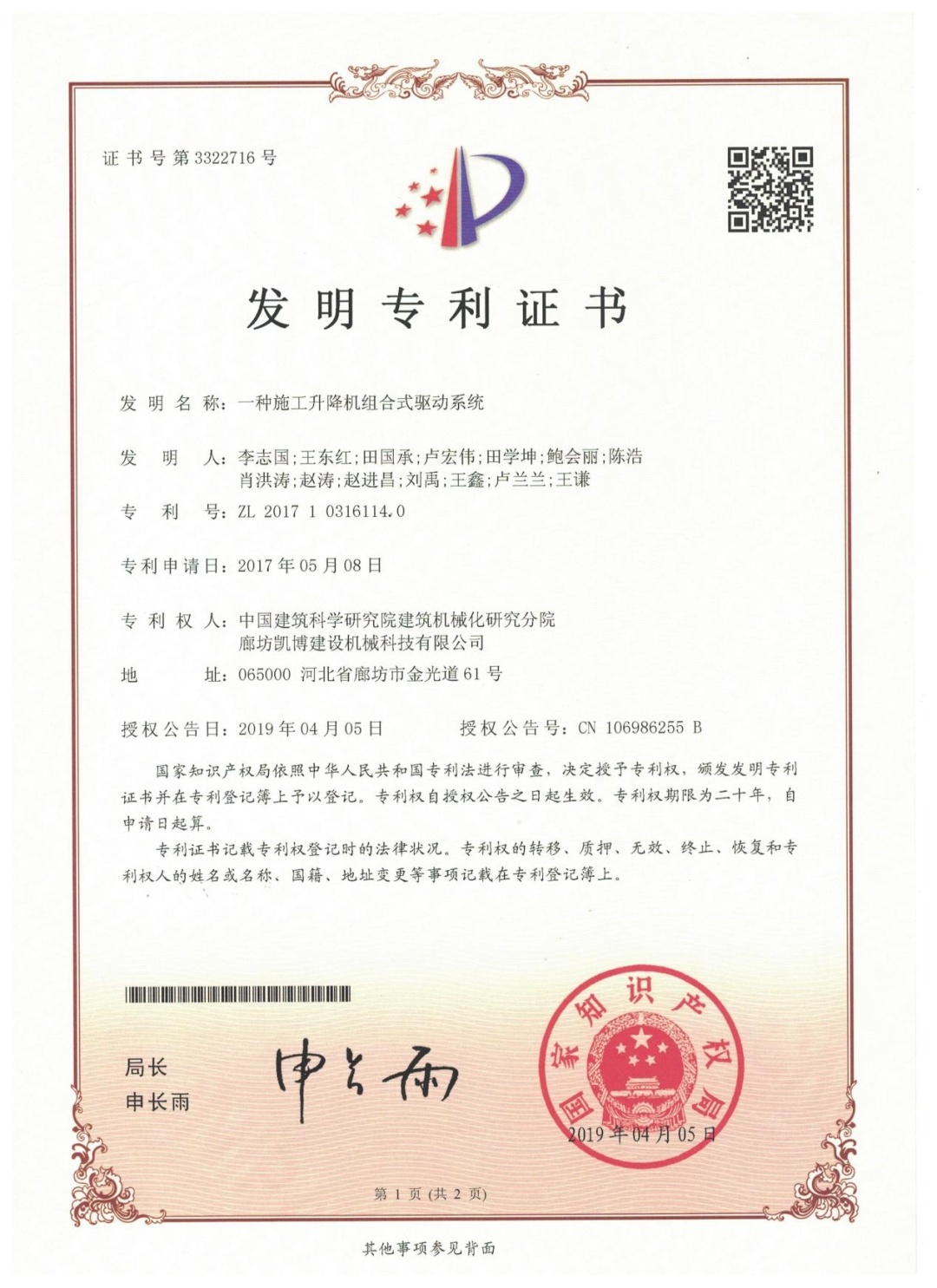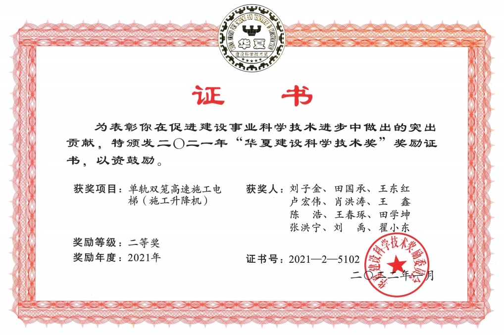 ? ? ? ? ? 本產(chǎn)品獲2項(xiàng)發(fā)明專利——施工升降機(jī)組合式驅(qū)動(dòng)系統(tǒng)(專利編號(hào):ZL201710316114.0)和手動(dòng)離合增力矩裝置(專利編號(hào):ZL201610933946.2);主編參編GB/T37537-2019《施工升降機(jī)安全監(jiān)控系統(tǒng)》、GB/T 26557《吊籠有垂直導(dǎo)向的人貨兩用施工升降機(jī)》兩項(xiàng)國家標(biāo)準(zhǔn);2021年榮獲“華夏建設(shè)科學(xué)技術(shù)獎(jiǎng)”二等獎(jiǎng)。為解決我國超高層建筑人員物料垂直運(yùn)輸?shù)母咝О踩椒€(wěn)運(yùn)行難題提供了強(qiáng)有力的技術(shù)支撐。