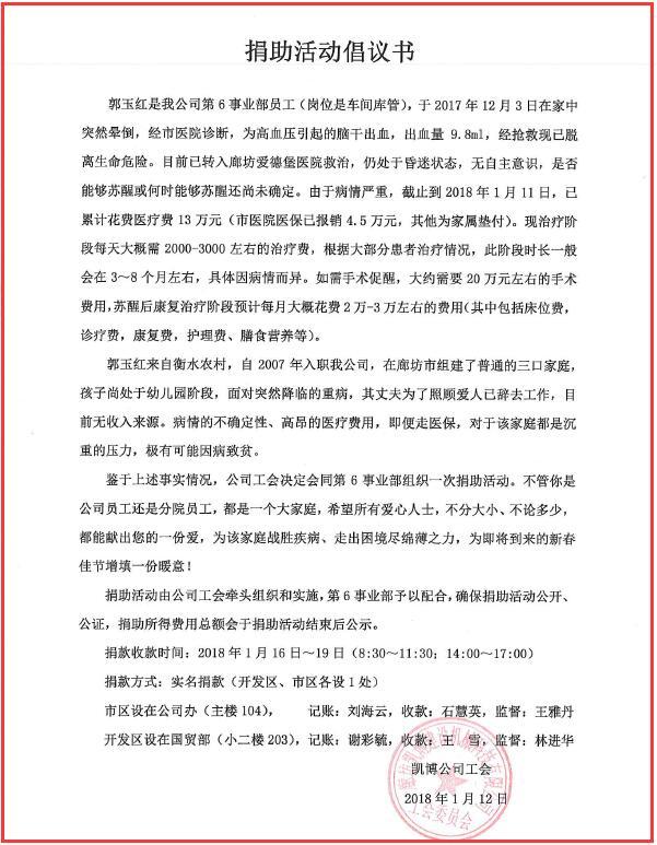 一方有難,八方支援。我公司第六事業(yè)部員工郭玉紅(崗位是車間庫管)于2017年12月3日在家中突然暈倒,經(jīng)市醫(yī)院診斷,為高血壓引起的腦干出血,經(jīng)搶救現(xiàn)已脫離生命危險(xiǎn),目前已轉(zhuǎn)入廊坊愛德堡醫(yī)院救治,仍處于昏迷狀態(tài),無自主意識(shí),是否能夠蘇醒或何時(shí)能夠蘇醒還無法判斷。郭玉紅來自衡水農(nóng)村,自2007年入職我公司,在廊坊市組建了普通的三口家庭,孩子尚處于幼兒園階段,面對(duì)突然降臨的重病,其丈夫?yàn)榱苏疹檺廴艘艳o去工作,目前無收入來源。不論經(jīng)濟(jì)層面還是精神層面,病情的不確定性、高昂的醫(yī)療費(fèi)用,對(duì)于該家庭都是極其沉重的壓力,極有可能因病致貧。